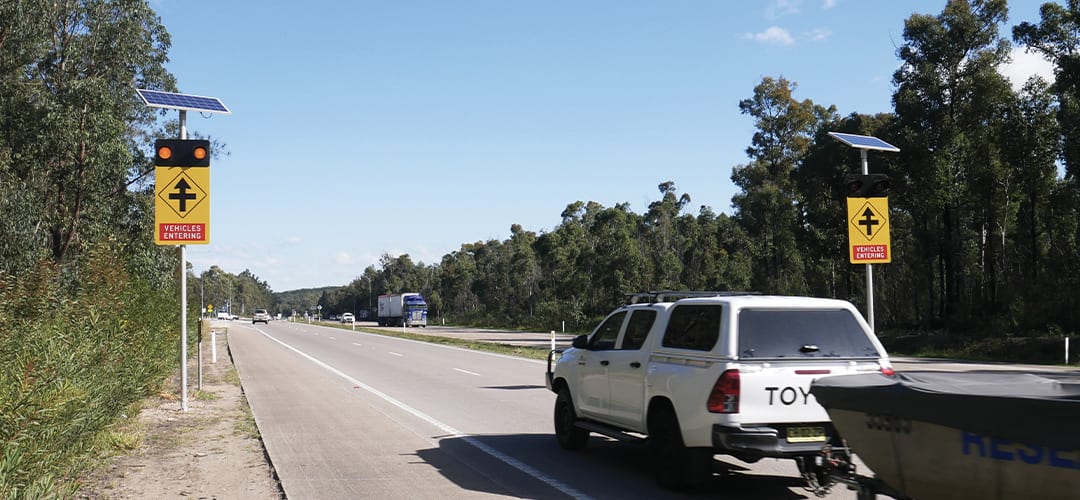 Hi-Vis worked closely with Transport for NSW to provide the solution of installing a range of several Radar Activated Signs on the M1 Southbound towards Newcastle and Northbound away from Newcastle to slow down drivers and also provide warning activations on side roads of entering traffic. Radar was installed to identify entering traffic with dual LED flashing light as a alert and warning system