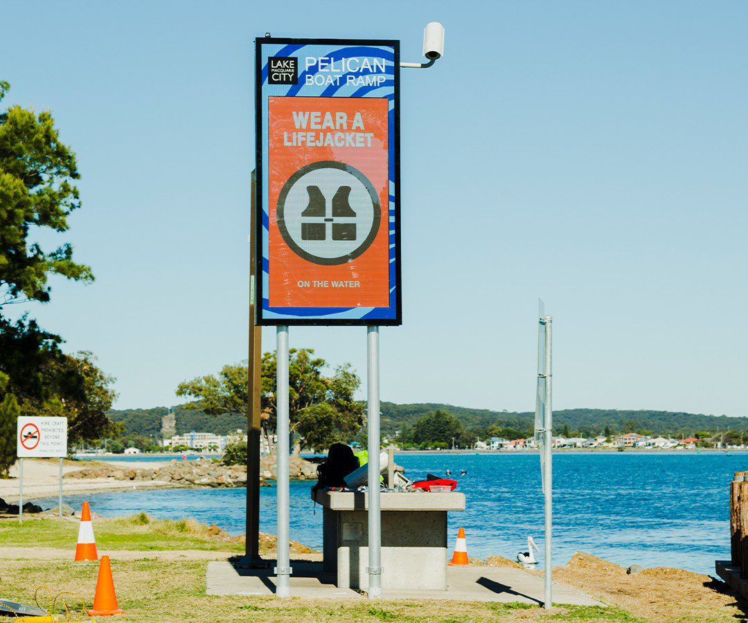 Hi-Vis installed latest camera technology with a software system giving actual visibility of the vehicles in use. The full colour screen also displays current weather, water temperature and tidal information plus any additional safety messages LMCC felt are necessary. The screen itself is easily updated by LMCC staff from their Speers Point office via a Content Management Systems deployed all by Hi-Vis.